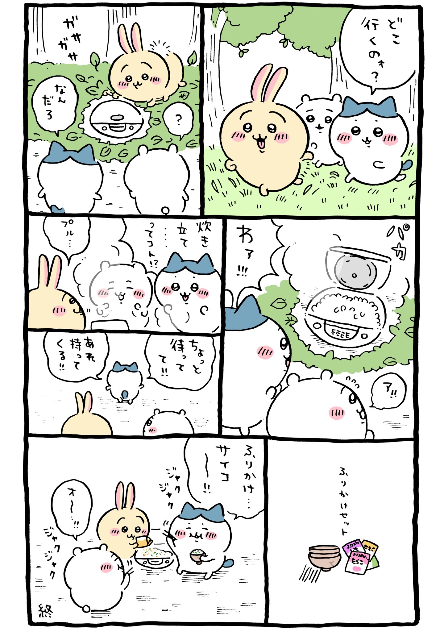 「ちいかわすいはんき」との関係は明言されていませんが、上記の漫画には「ふりかけセット」も登場しており、ファンなら思わずニヤリと笑ってしまうような付録になっているのではないでしょうか。